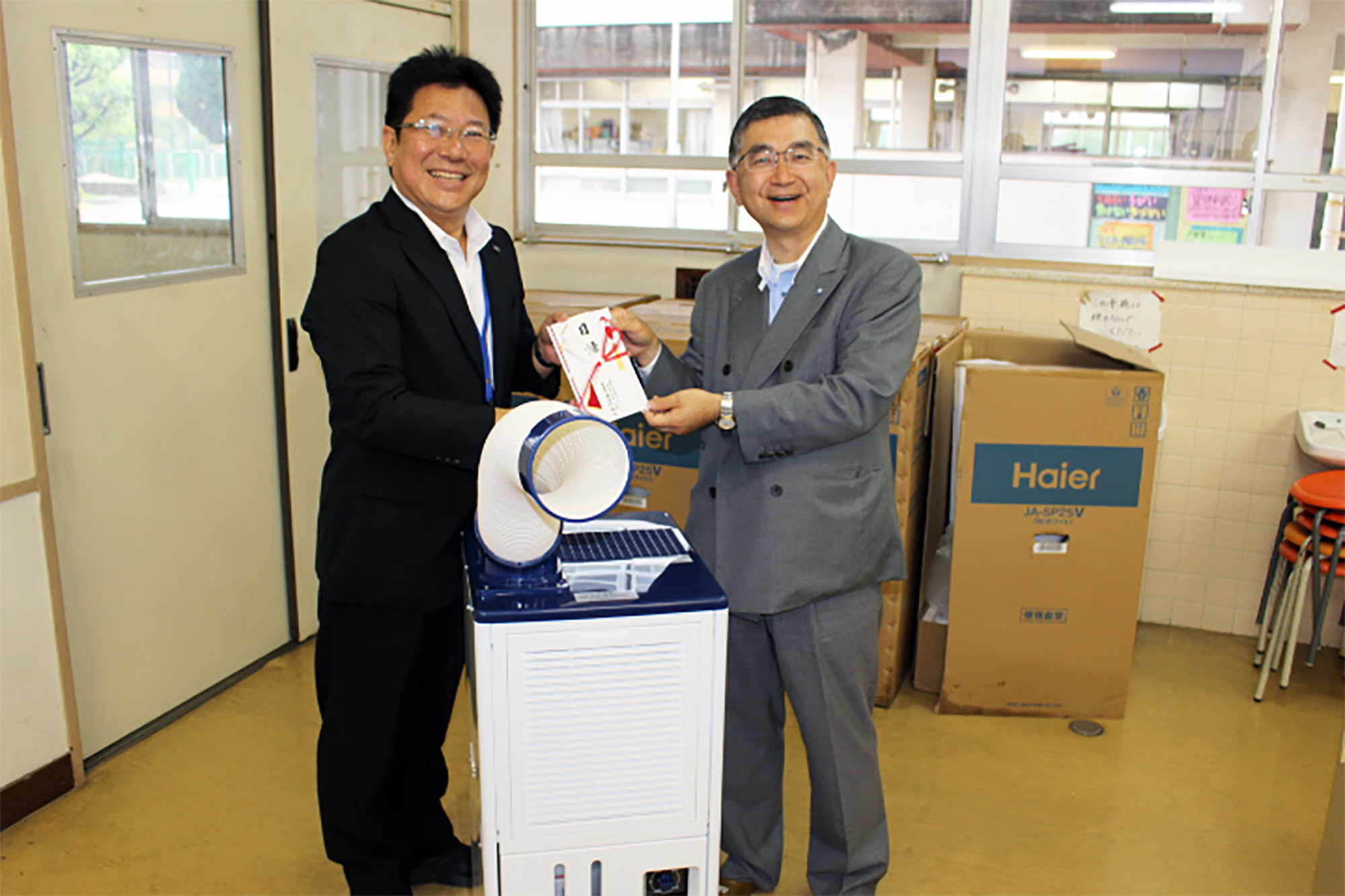 吉島中学校・吉島東小学校・吉島小学校・中島小学校の4校に、スポットクーラー14台、冷風機3台、ミストファン4台、ノートパソコン2台、温風ファン付大型ストーブ8台を寄贈致しました。
