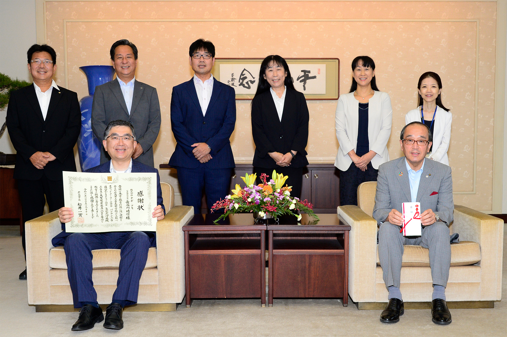 吉島中学校・吉島東小学校・吉島小学校・中島小学校の4校に、スポットクーラー14台、冷風機3台、ミストファン4台、ノートパソコン2台、温風ファン付大型ストーブ8台を寄贈したことで、広島市の松井市長より感謝状を頂戴しました。