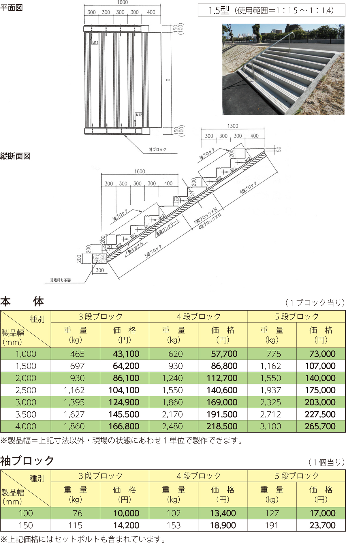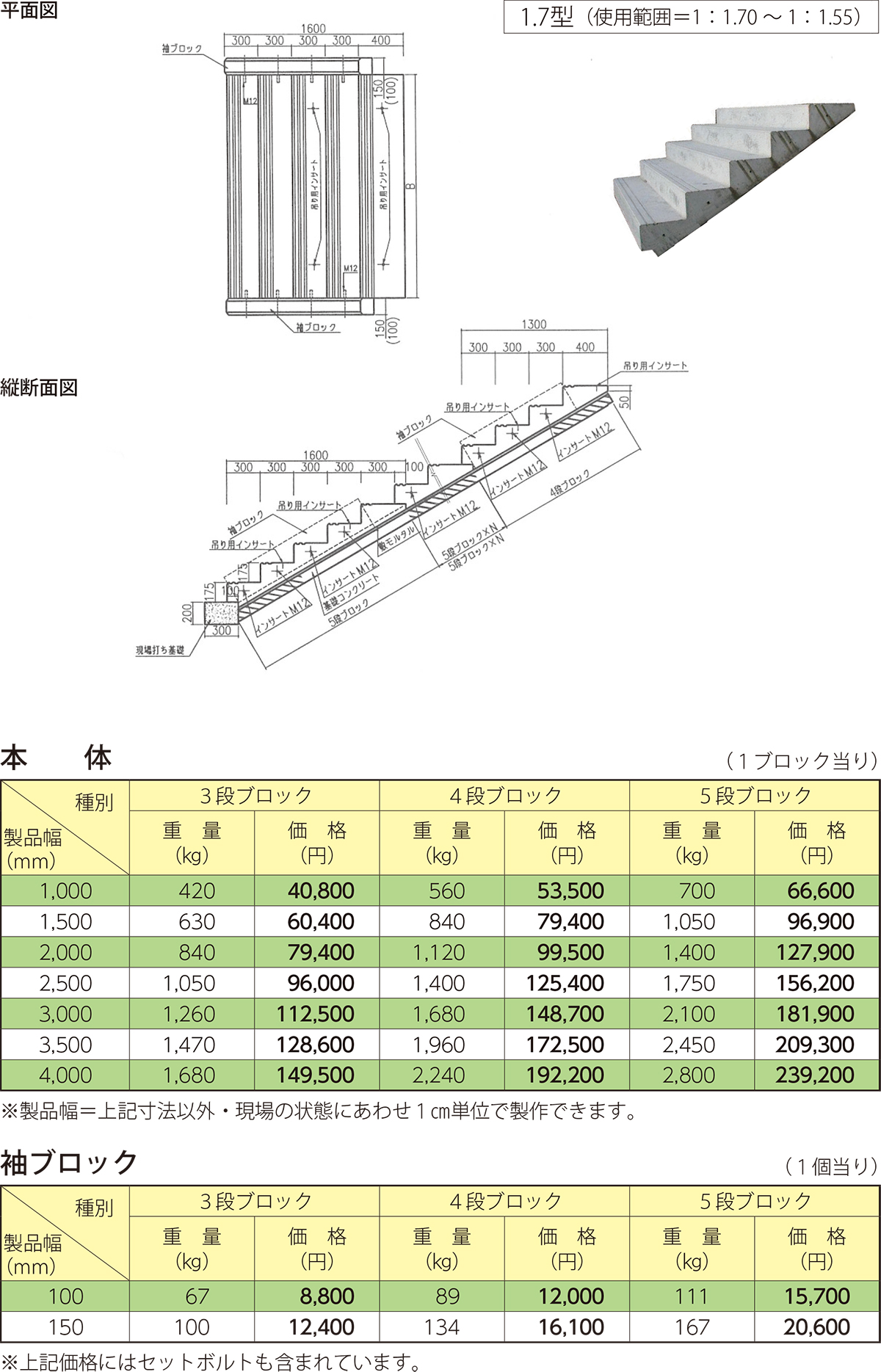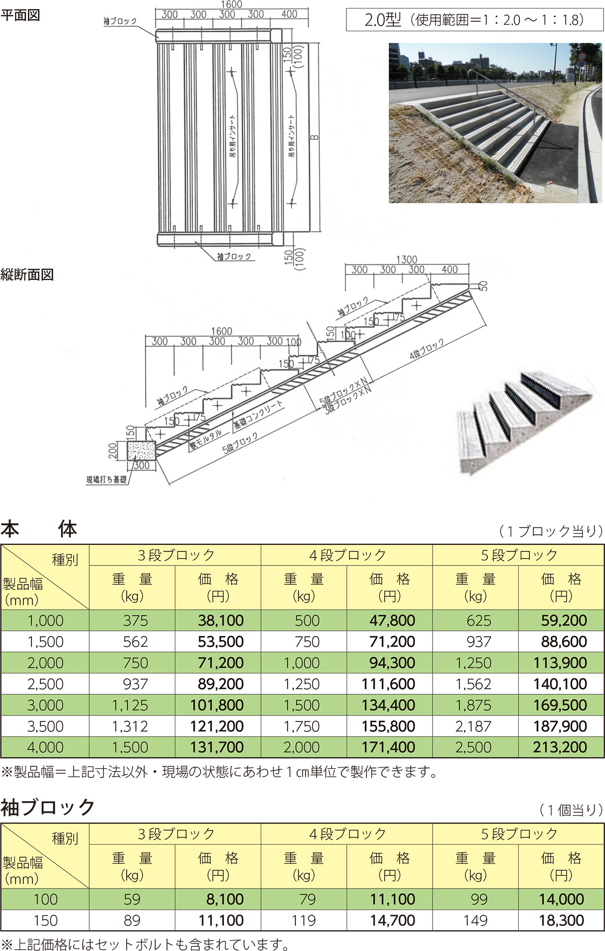 階段ブロック 製品概要 主に、河川や公園等で使用されている階段ブロック。 現場打ちのコンクリート階段をプレキャスト化することにより、迅速な階段設置が叶います。 製品は設置場所に合わせて、セミオーダーで承ります。 ・法勾配は、1:1.5/1:1.7/1:2.0に対応 ・表面に滑り止めのスリット加工 ・勾配に合わせた袖ブロックも製造 ・階段幅1.0m~4.0mまで50cmピッチで7種類で展開 ・3段/4段/5段と3種の段数タイプ 施工場所に合わせた勾配・大きさで、優れた仕上がり・簡単施工が可能です。 設計図