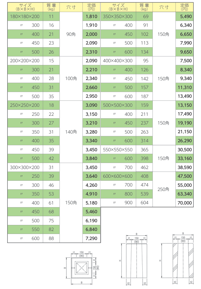 180×180~300×300 高さ200~500 21種類のラインアップがある
