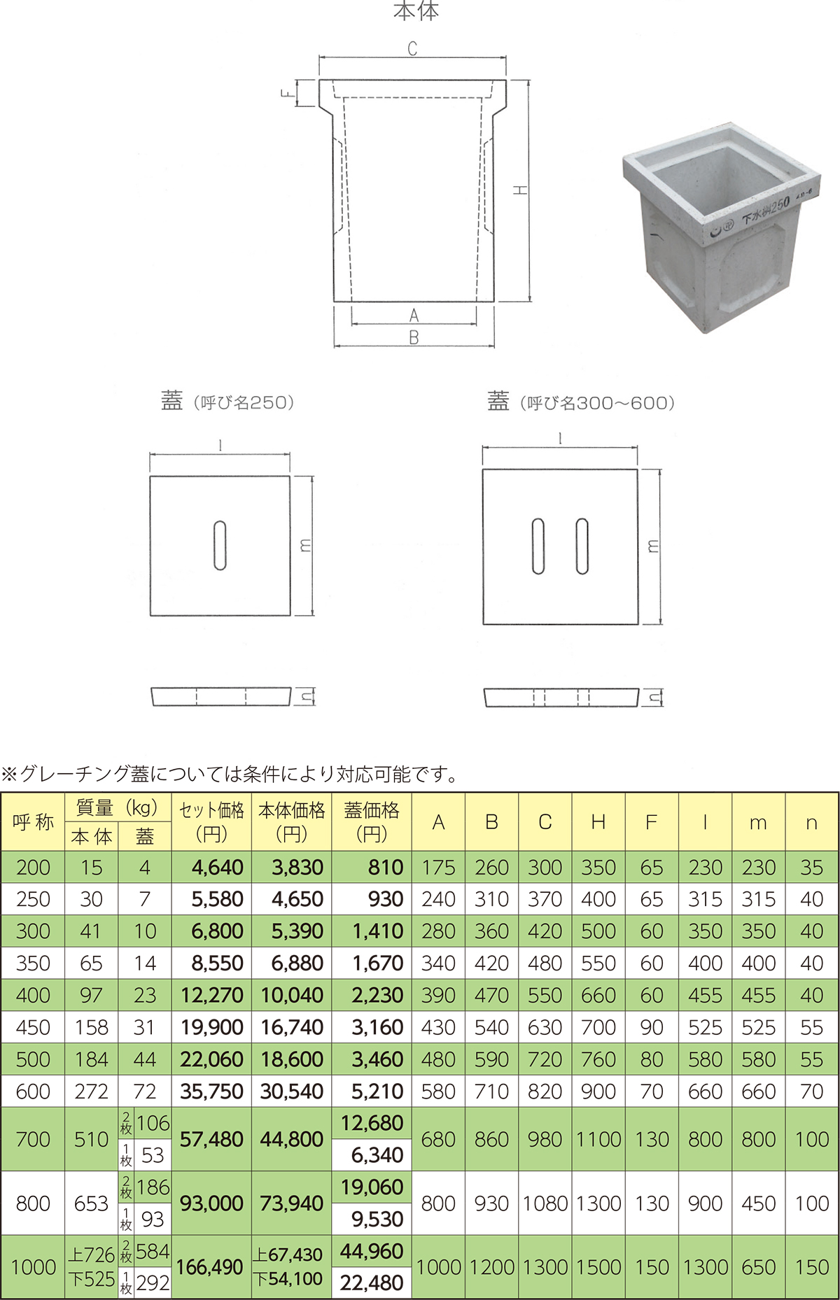 下水桝(溜桝) 製品概要 住宅内で使用される桝です。 用途 宅地造成、雨水排水 特徴 宅内桝として車両が上載しない場所に主として使用 250・300・350・400・450・500・600・800・1000 設計図